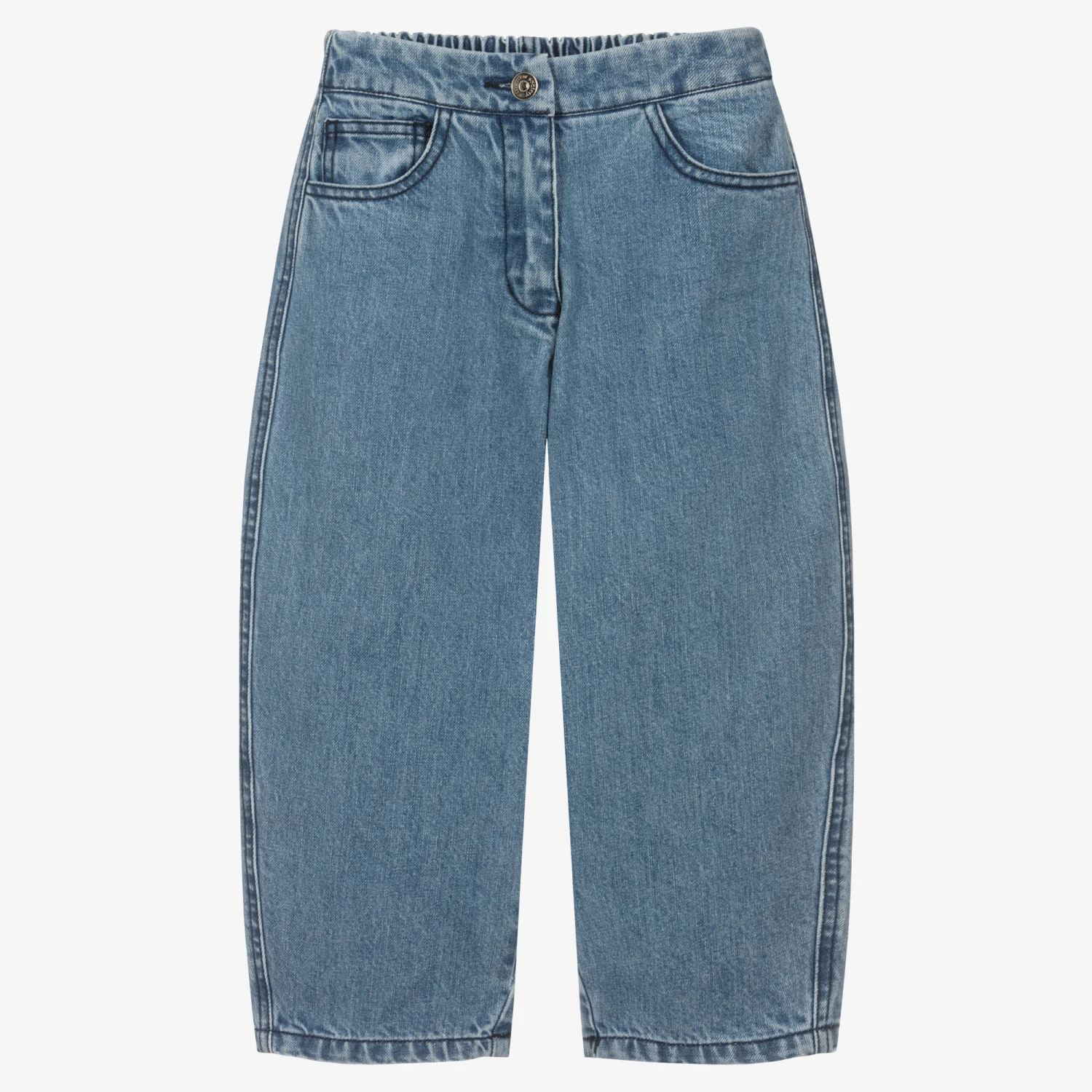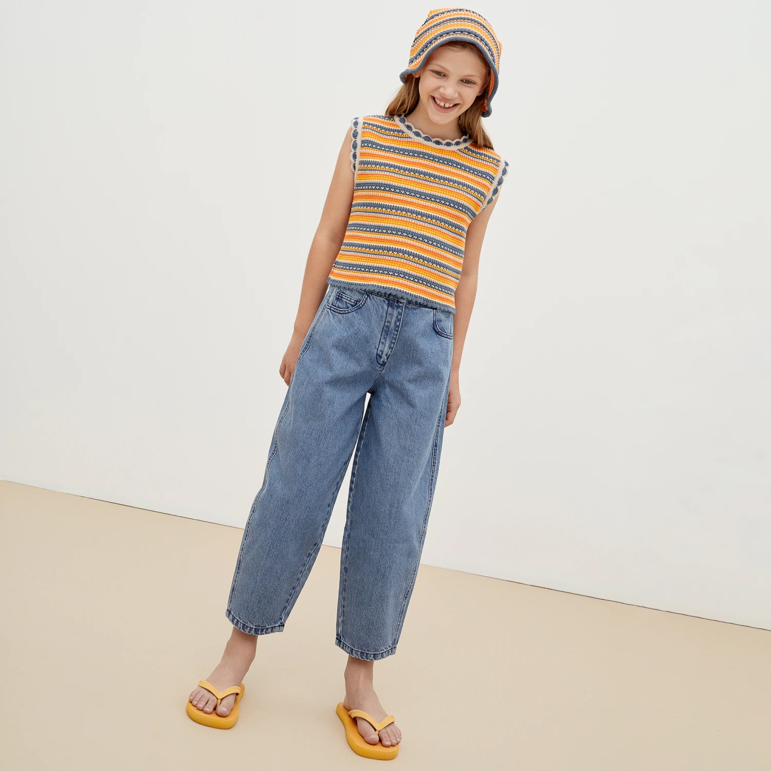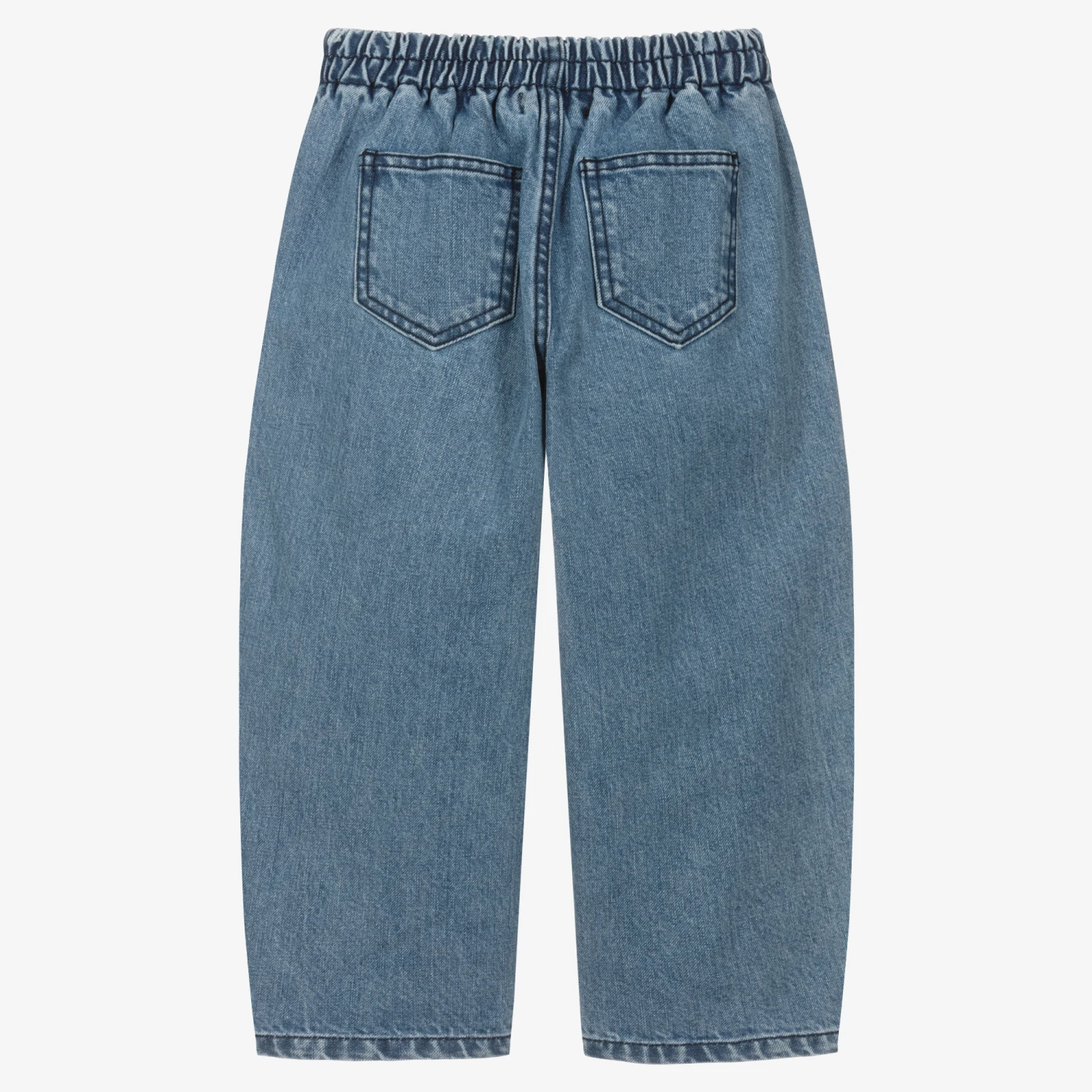 Mid-blue wash denim jeans for girls by The New Society. These cool and comfortable jeans have a flattering high, part-elasticated waist, an on-trend relaxed fit that tapers towards the ankle, and classic five-pocket styling. They fasten easily with a branded button and zip on the front.
