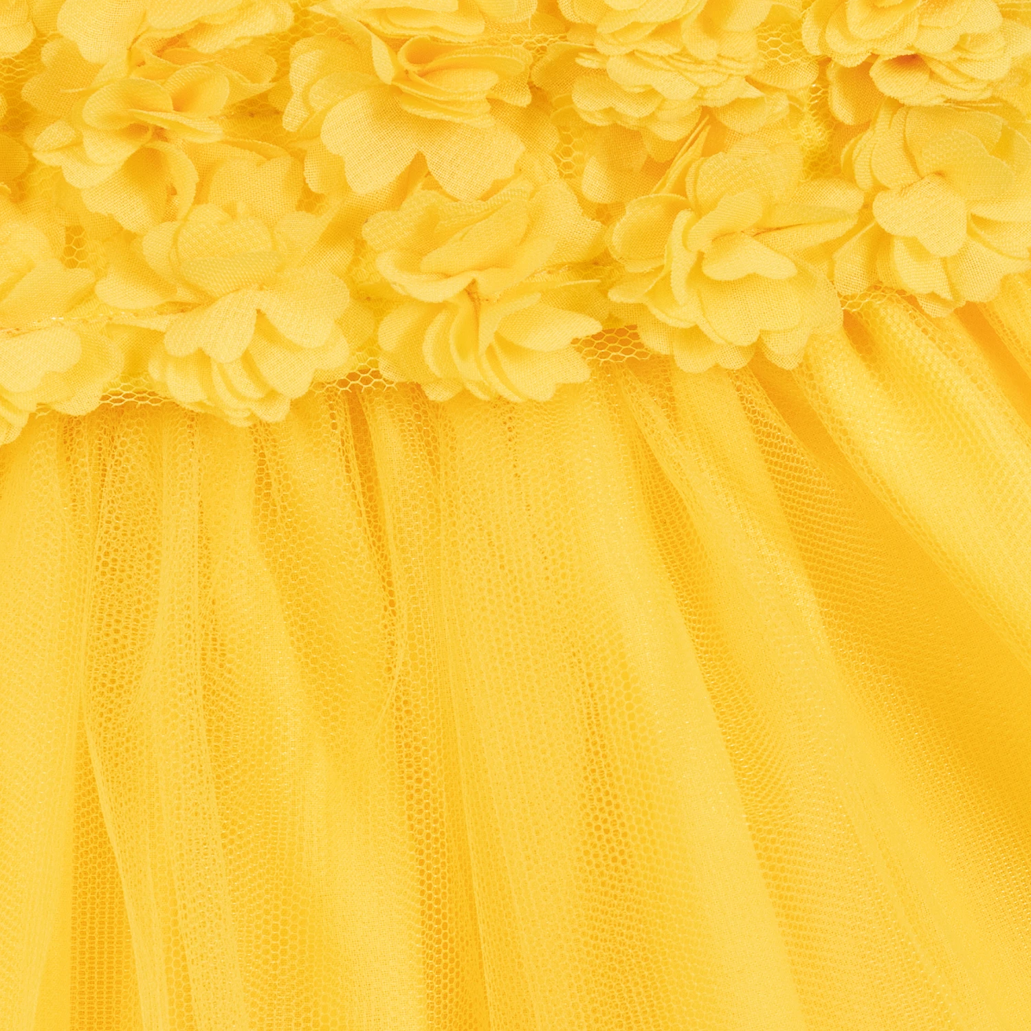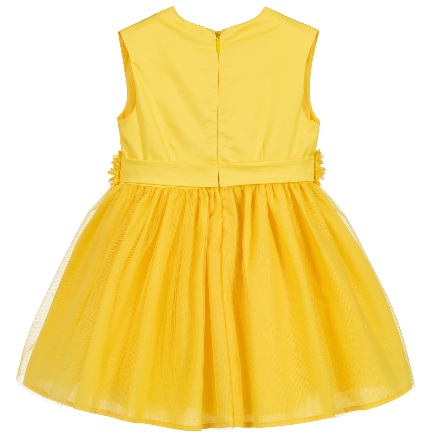 A lovely yellow dress for girls from Tutto Piccolo, made and lined in lightweight cotton. It has a pretty tulle and fabric flower waistband with a fine tulle overlayer on the gathered skirt. There is a concealed zip fastening on the back and tulle trim on the lining for extra volume.
