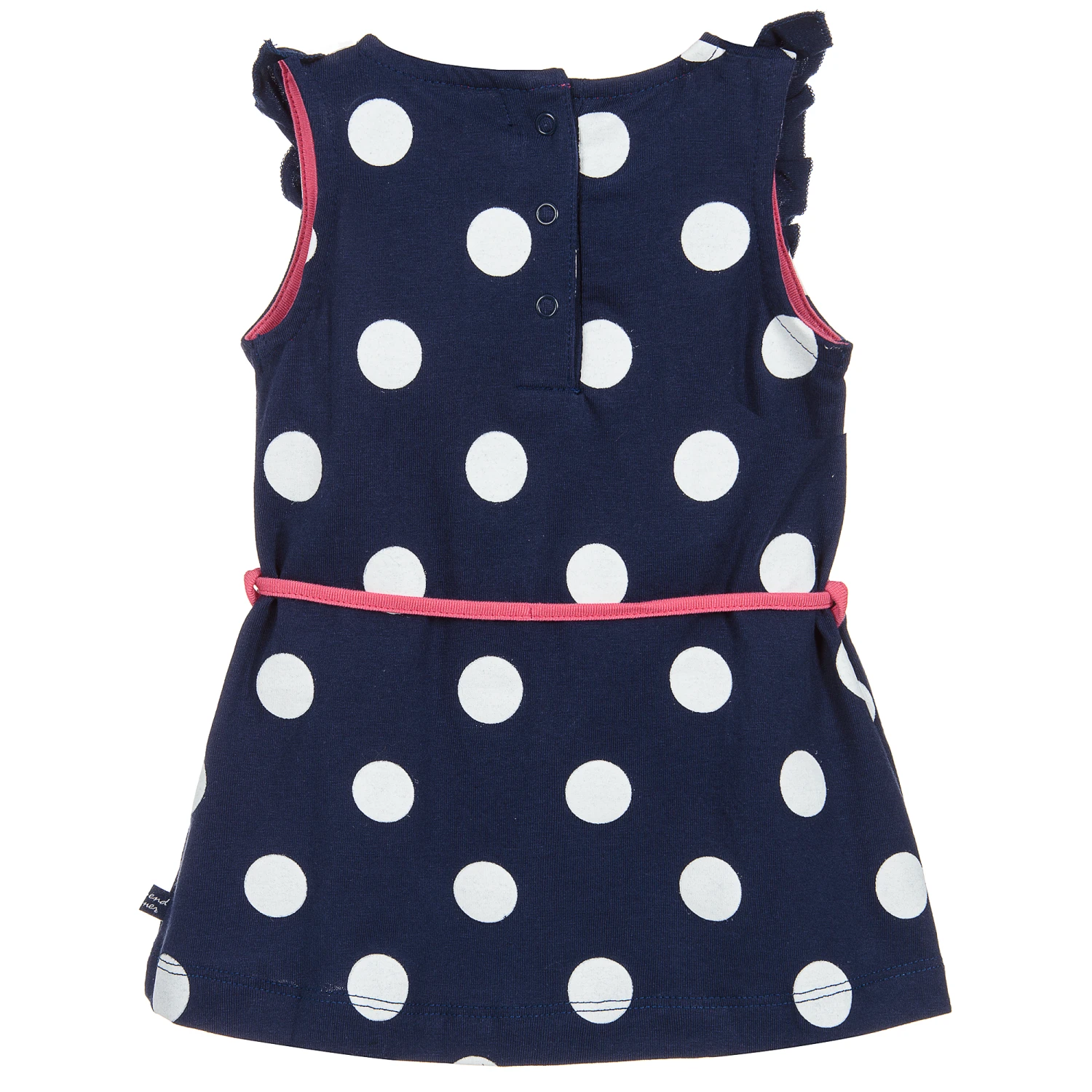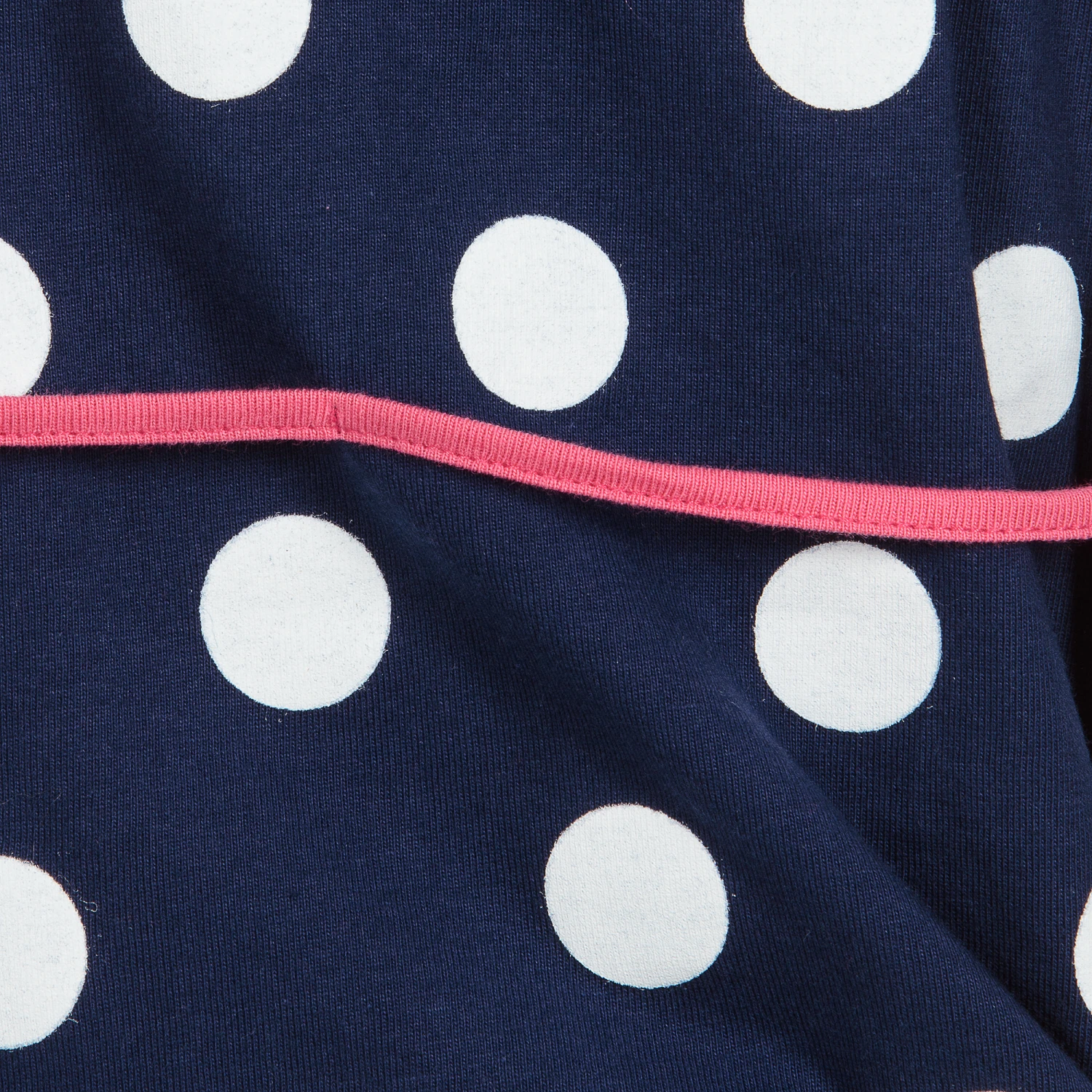 Navy blue dress for baby girls by Week-end à la mer. Made in soft and stretchy cotton jersey, with a white polka dot pattern. It has pretty ruffles on the bodice and a pink tie around the waist.