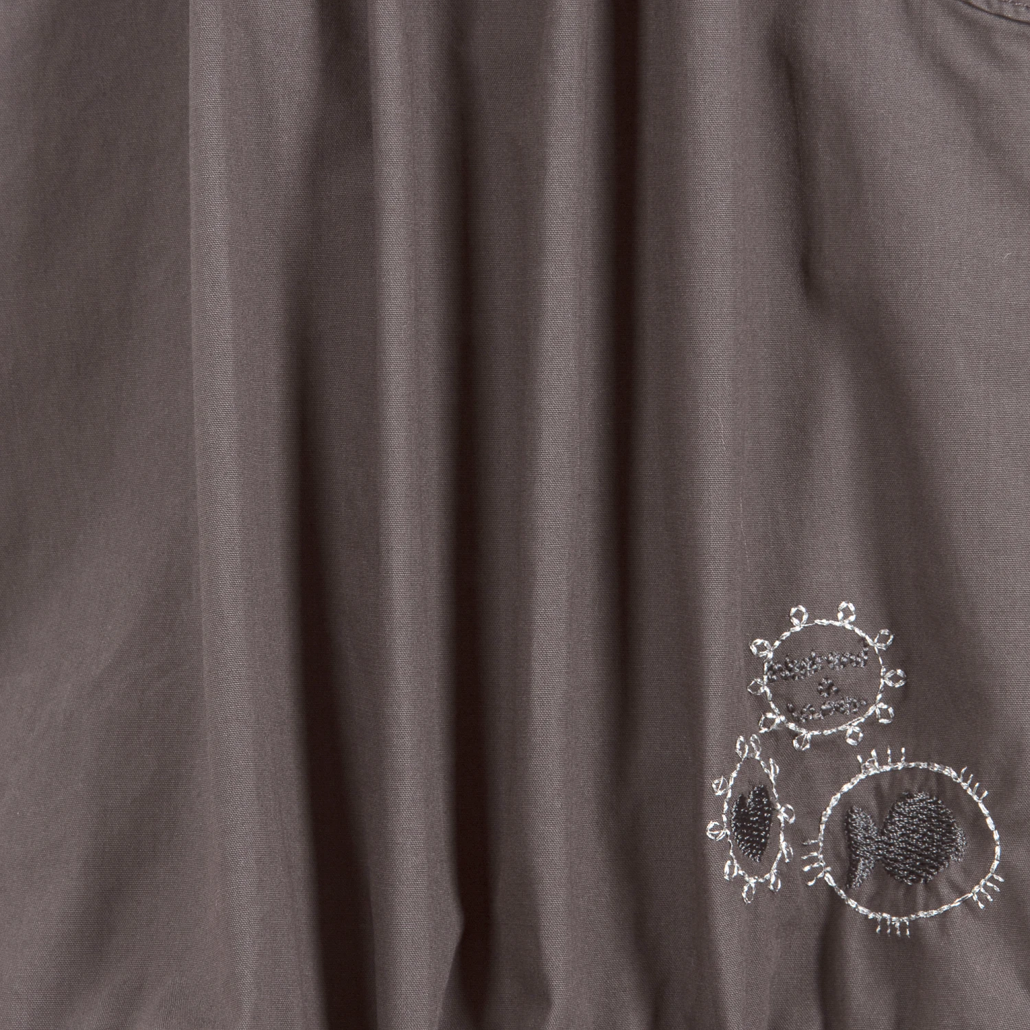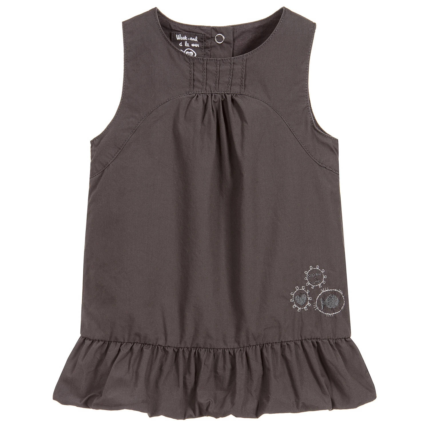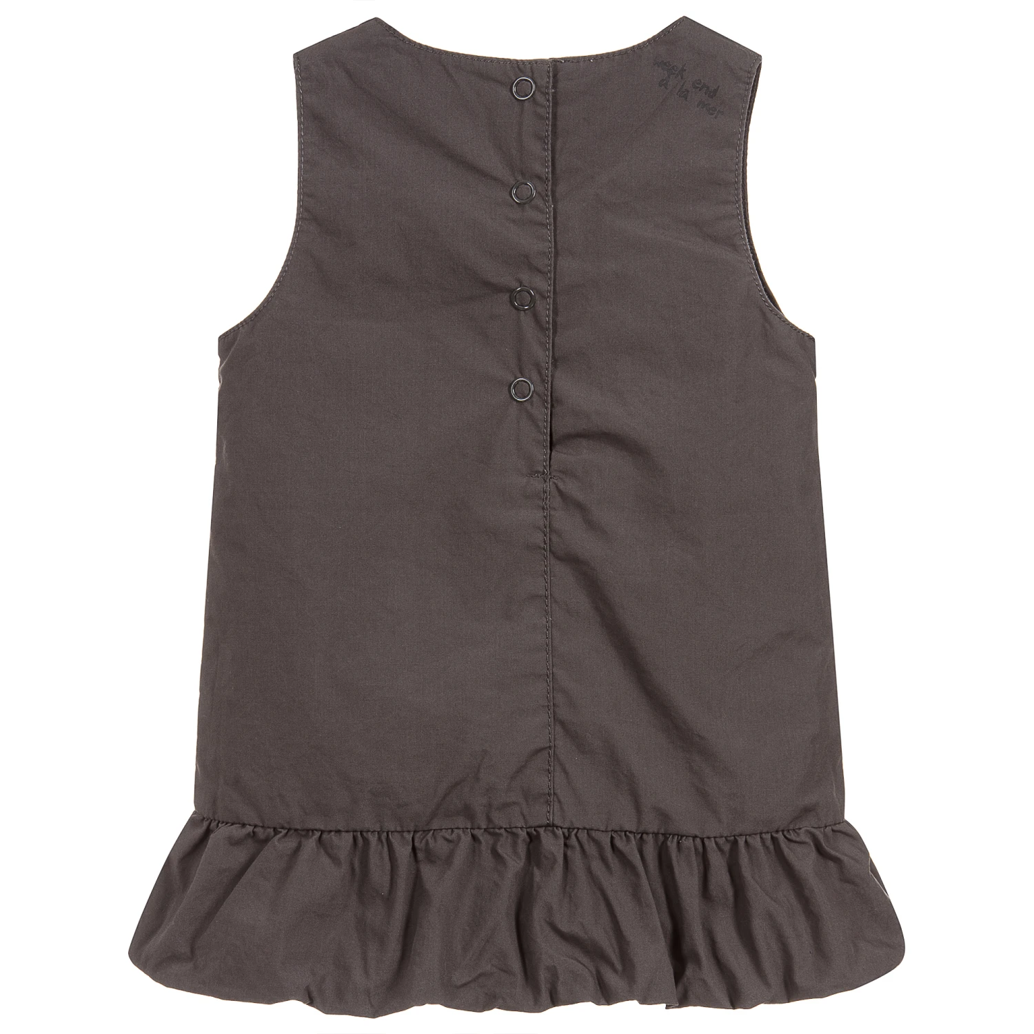 Baby girls grey cotton dress by Week-end à la mer. It has silver thread embroidery on the front, and a pretty ruffled, elasticated hemline. There is popper fastening on the back.