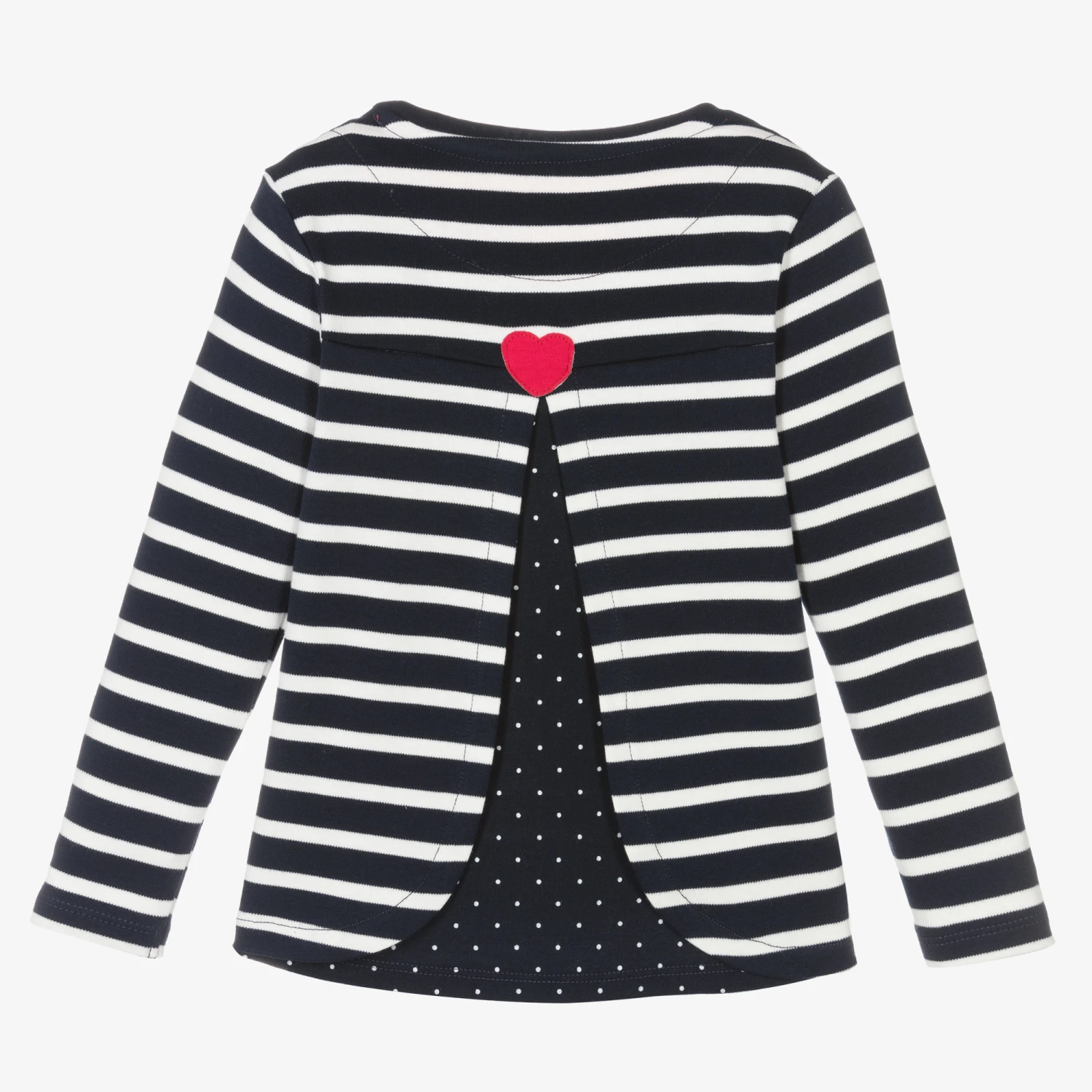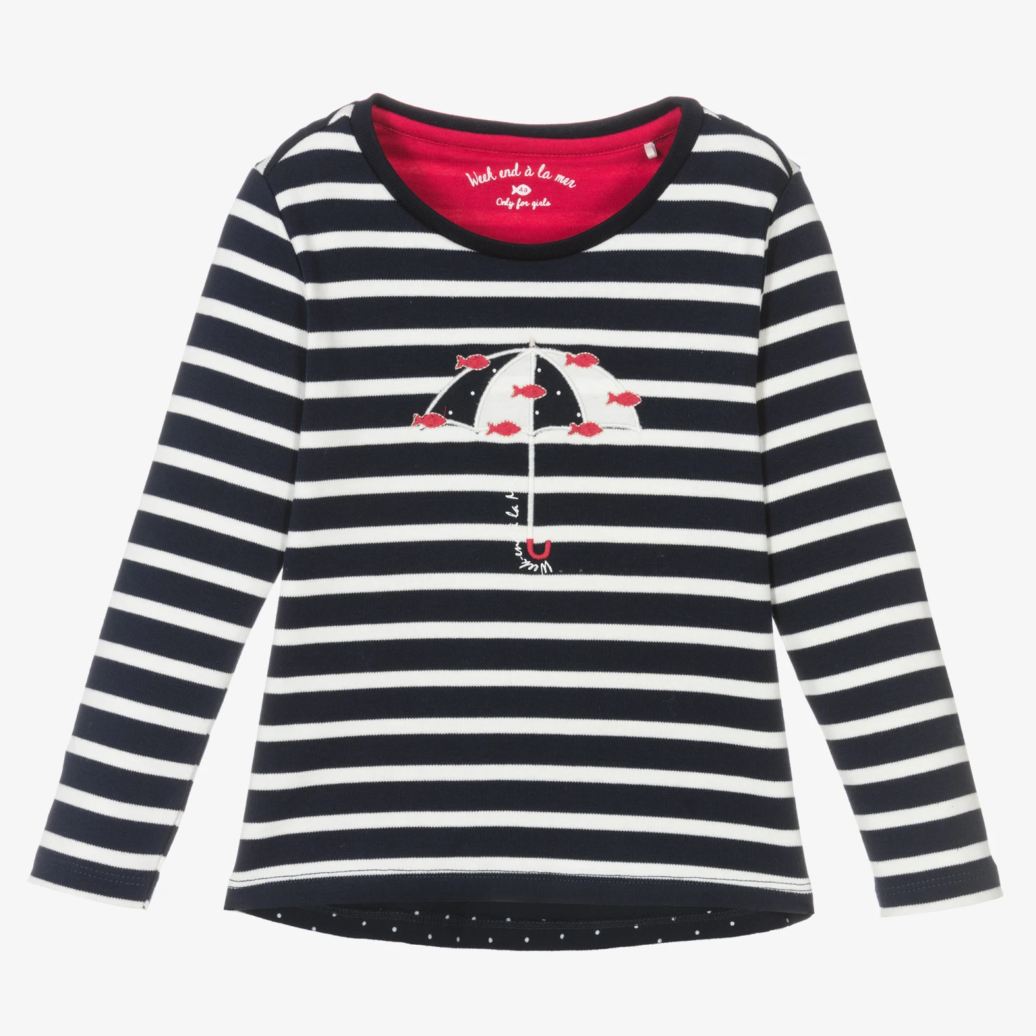 Navy blue and white Breton stripe top for girls by French brand Week-end à la mer, made in soft, stretchy cotton jersey. Easy to wear, it has a sweet umbrella print on the front with contrasting embroidered pink fish. It has a blue and white polkadot insert on the back with a romantic, pink love heart for added charm.