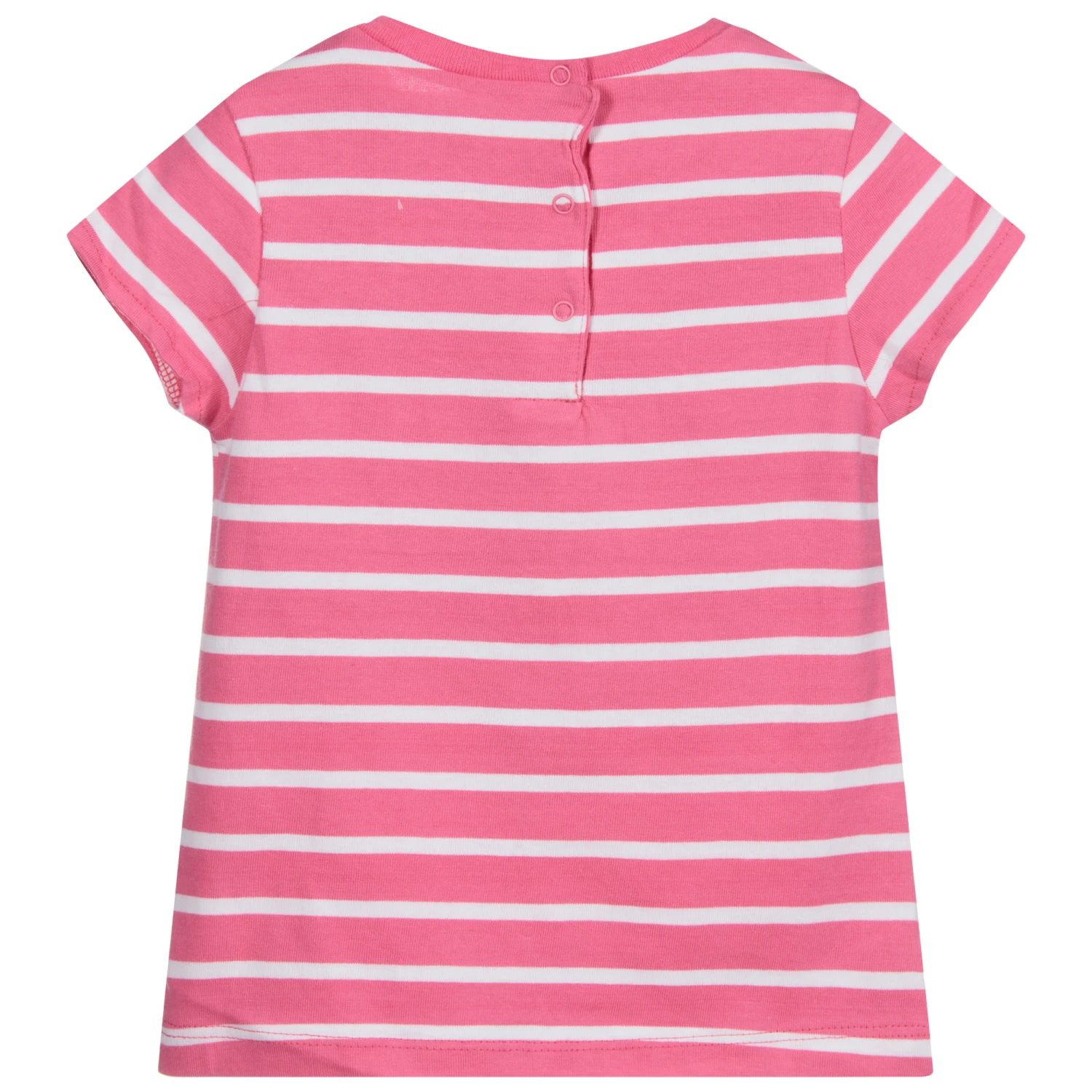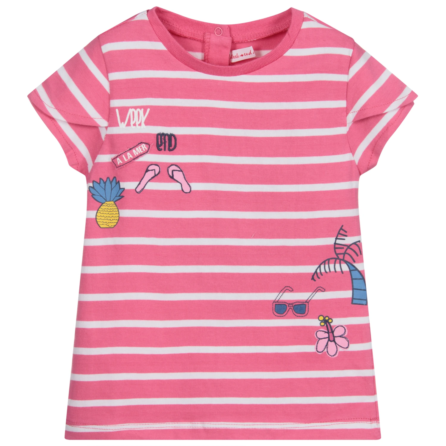 Girls pink and white striped T-shirt by Week-end à la mer, made in soft cotton jersey. It has fun beach-themed motifs on the front, with back popper fastenings.