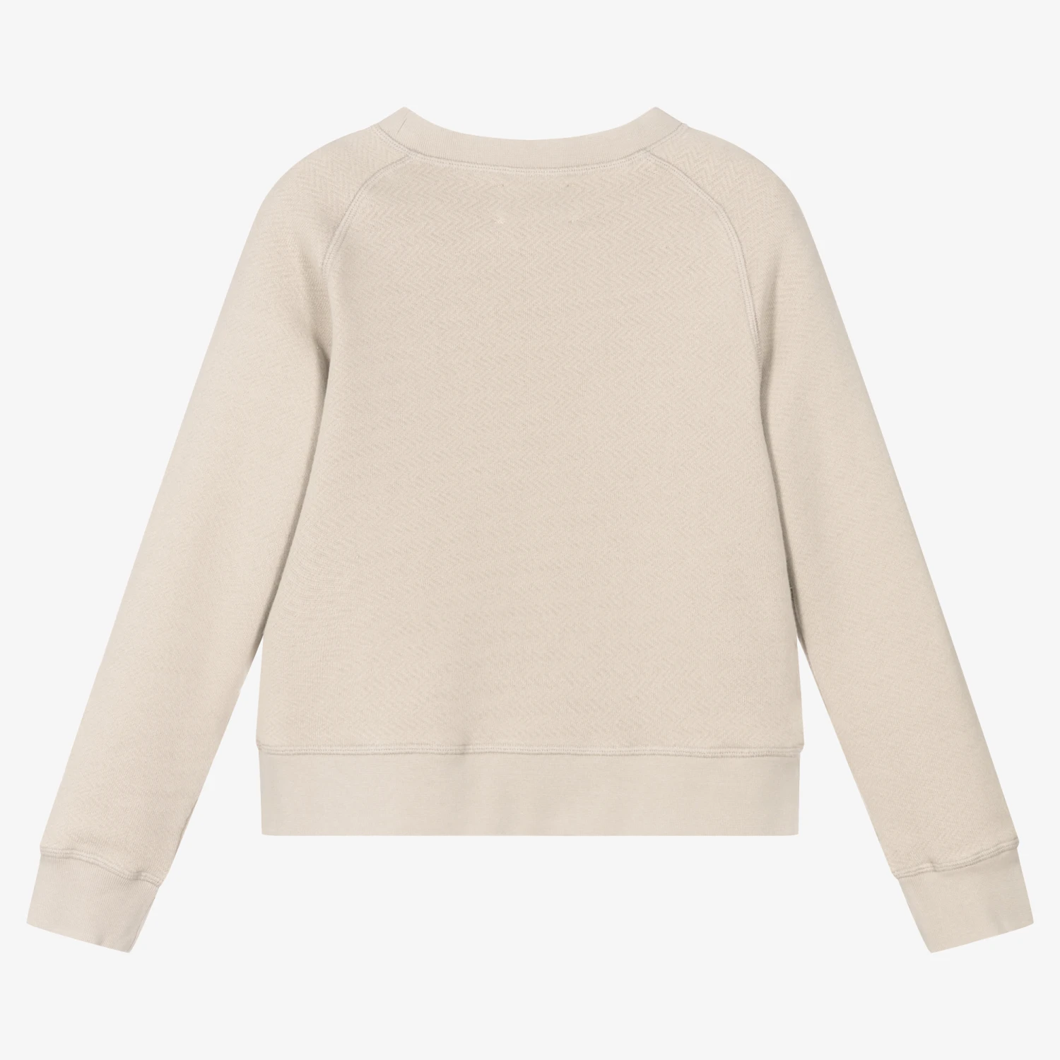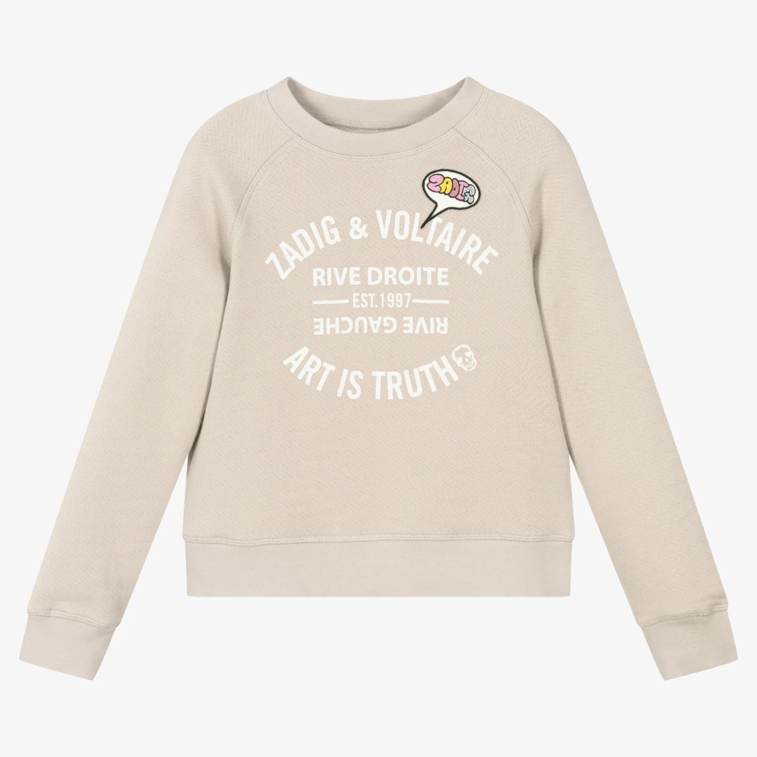 A pale grey-beige sweatshirt for girls by Zadig&Voltaire, made in stretchy, mid-weight cotton jersey with a faint zigzag pattern. Inspired by the adult collection, it features a fun cartoon-style motif inside a textured speech bubble appliqué. Reflective of the brand, an ‘Art is truth’ slogan sits below the college-style logo, alongside a subtle skull motif. It has a classic crew neck and gently ribbed trims, making it a comfortable choice for casual days.